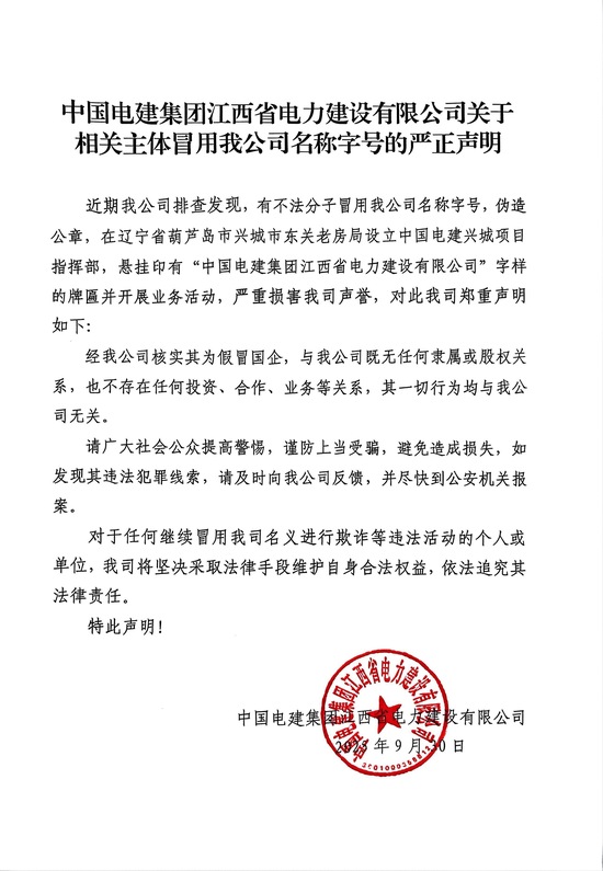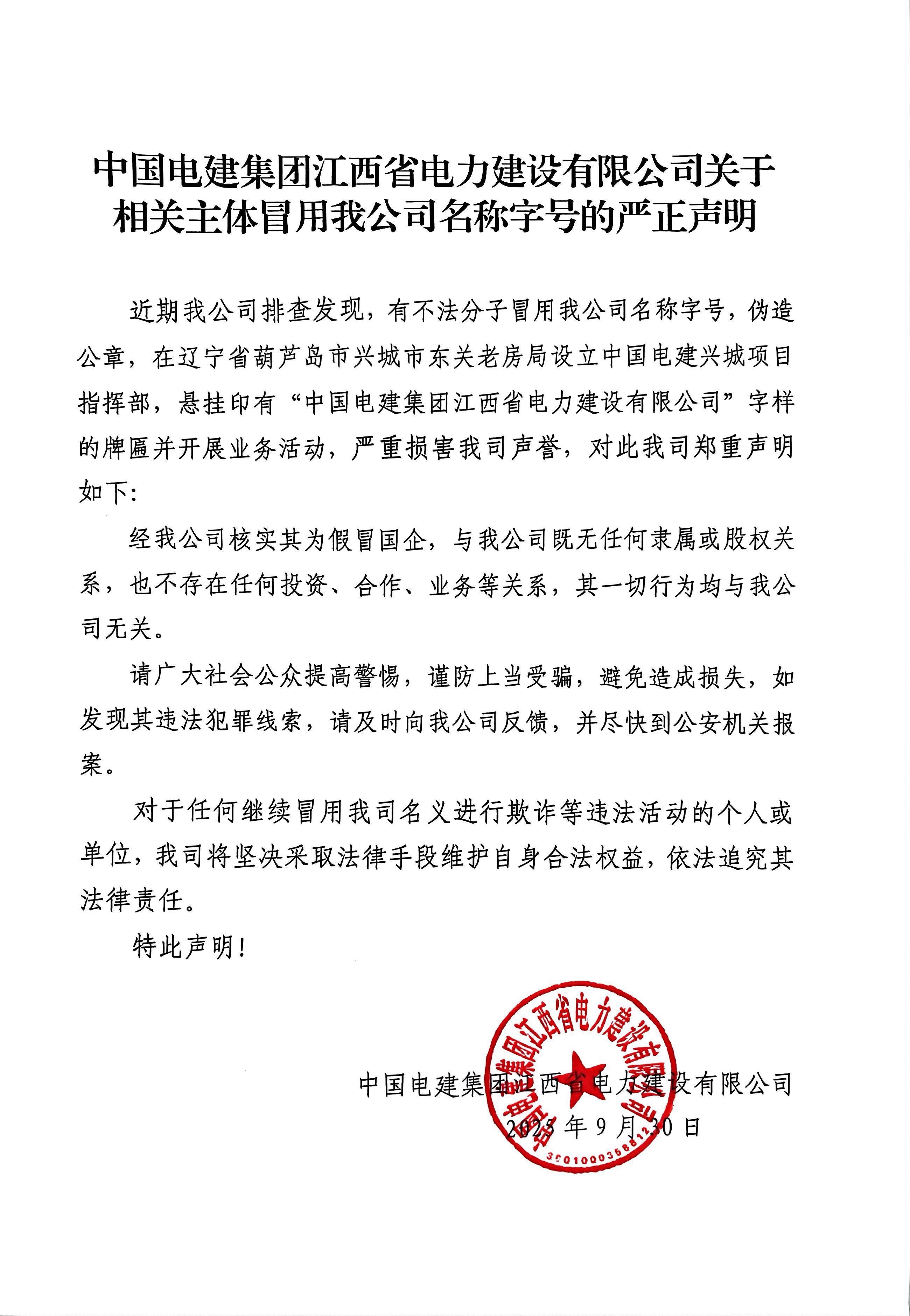 中国电建集团江西省电力建设有限公司关于相关主体冒用我公司名称字号的严正声明